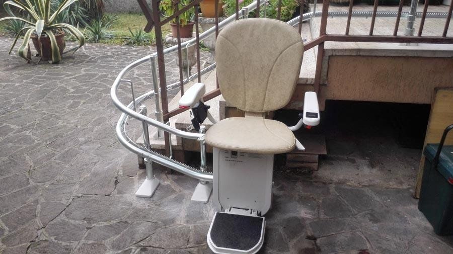 Servoscala a poltroncina con trazione a cremagliera con motore a batterie 24 V adattabile per percorsi rettilinei e curvilinei.